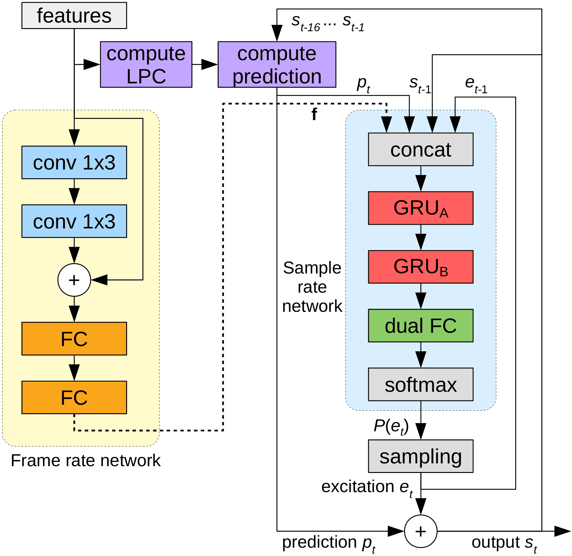 LPCNet은 Opus 코덱의 주요 기여자 중 한 명인 Jean-Marc Valin이 2018년 말에 제안한 모델로, WaveRNN을 기반으로 기존의 DSP 기술을 적용해 신경망을 경량화하여 속도를 높인 모델이다. 신경망에 모든 예측을 전가하는 대신 LPC Layer를 추가하여 현재 샘플과 함께 다음 샘플의 예측값을 같이 전달하여 뉴런의 개수를 효율적으로 줄인다.