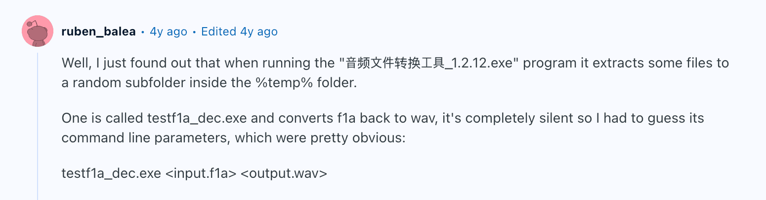 그러니까, 音频文件转换工具_1.2.20.exe 파일 실행하면 %temp% 경로 안에 여러가지 파일이 생기는데, 그 중에 testf1a_dec.exe가 f1a 파일을 wav 파일로 변환해준다는거다.