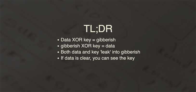 Jeroen Domburg 아저씨가 친절하게 설명해주듯이 XOR은 plaintext가 공백 문자열이면 key가 그대로 ciphertext에 노출되고, 같은 key를 여러번 재사용해도 ciphertext에 키가 leak 된다.