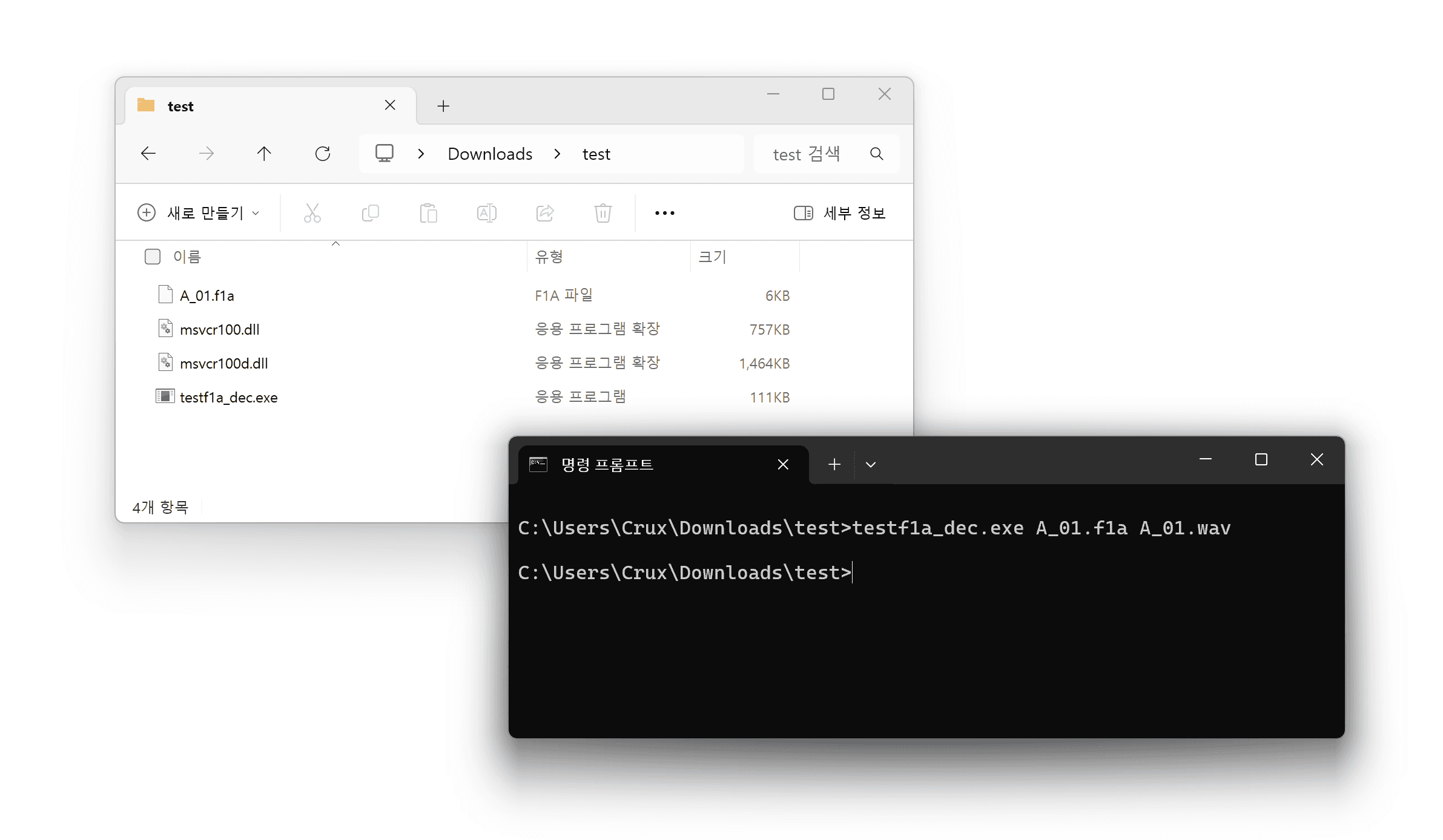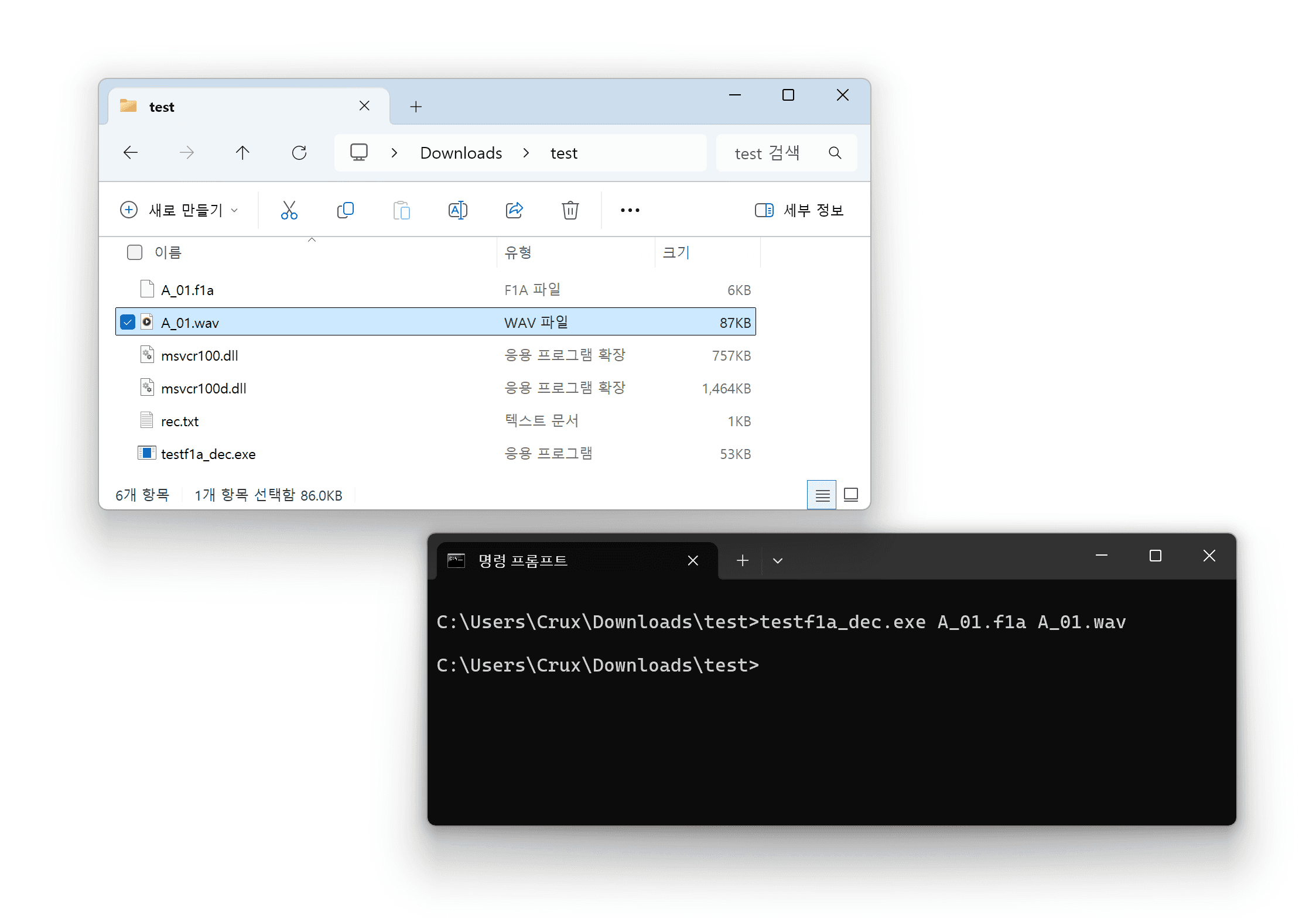 근데 저 레딧 댓글처럼 testf1a_dec.exe input.f1a output.wav 실행 해봐도 아무런 일도 일어나지 않았다.