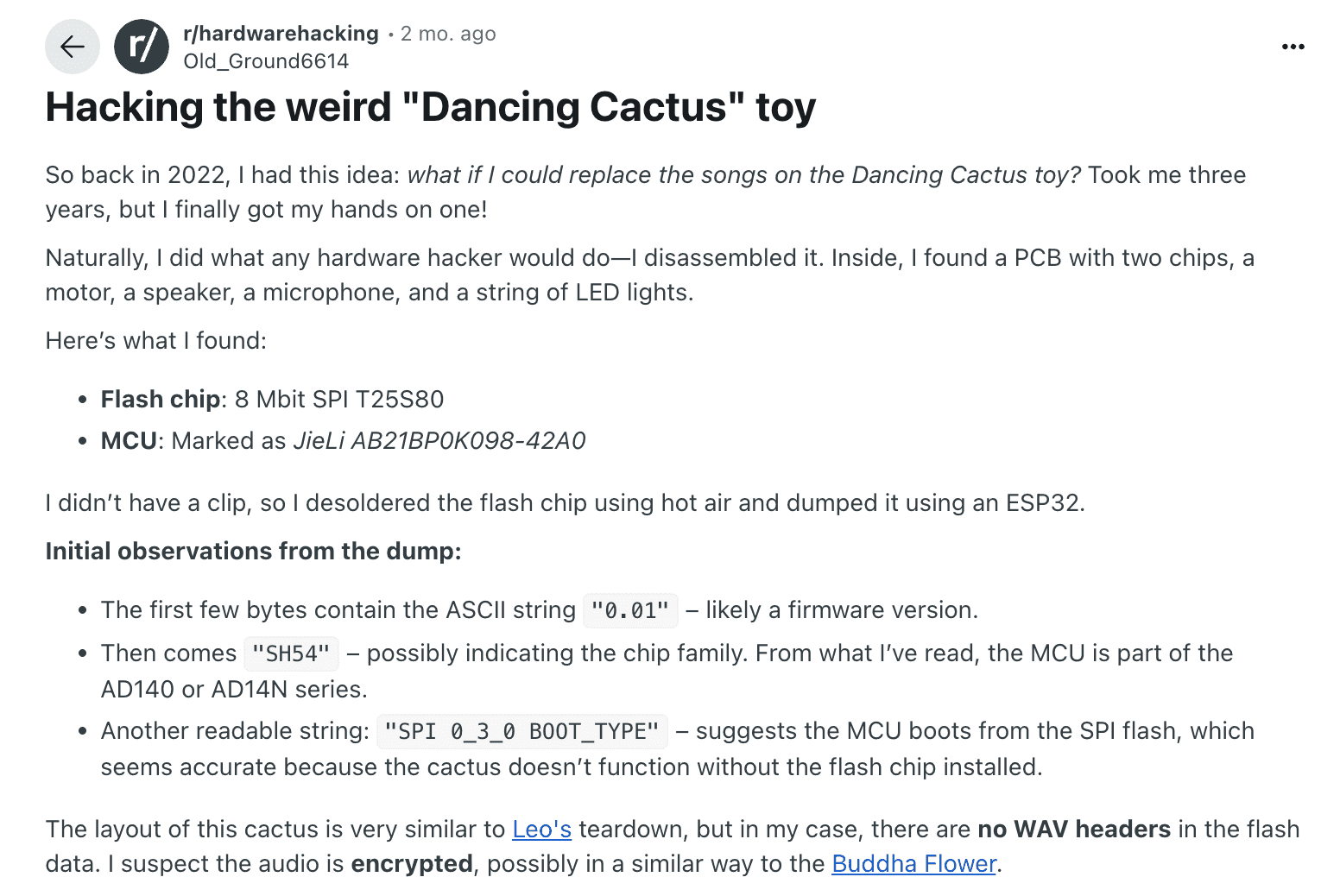 Dancing Cactus(춤추는 선인장?)라는 장난감을 분해해서 덤프 뜬 것 같은데, 보이스 디바이스랑 비슷하게 노래가 나오는 장난감인 것 같다. 그리고 MCU가 JieLi AB21BP0K098-42A0이라는데, 보이스 디바이스의 AB25BP2C923-55A0과 매우 비슷하다!